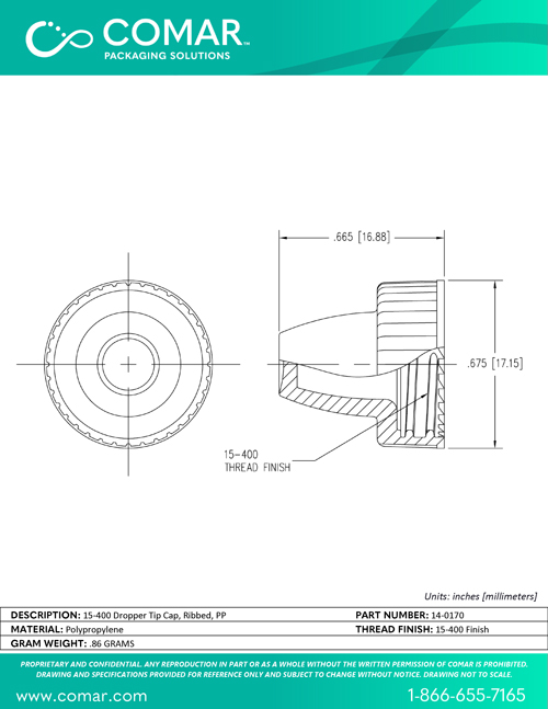 14-0170 Comar 15-400 Dropper Tip Cap, Ribbed, PP Tech Drawing