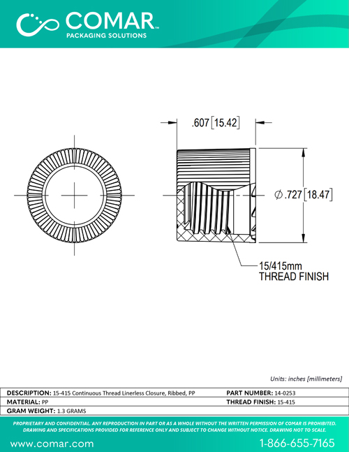 14-0253 Comar 15-415 Continuous Thread Linerless Closure, Ribbed, PP Tech Drawing