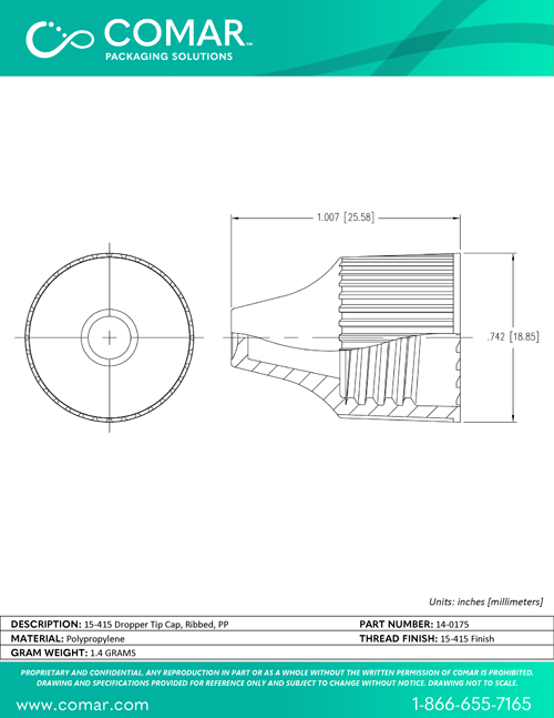14-0175 Comar 15-415 Dropper Tip Cap, Ribbed, PP Tech Drawing