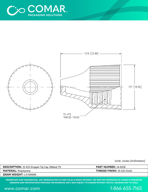 14-0358 Comar 15-415 Dropper Tip Cap, Ribbed, PS Tech Drawing