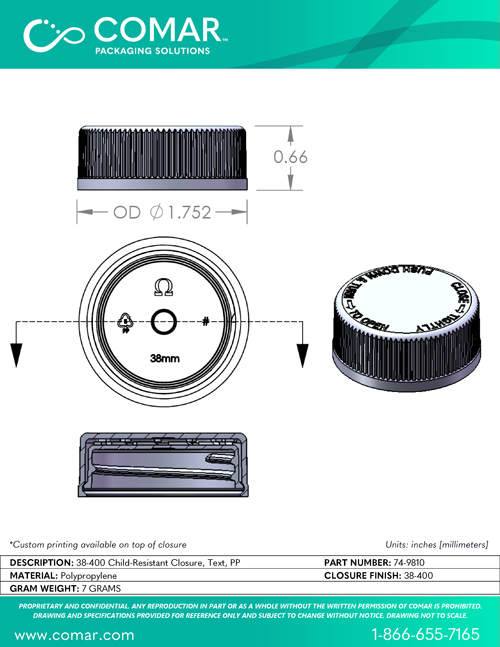 74-9810 Comar 38-400 Child-Resistant Closure, Text, PP Tech Drawing
