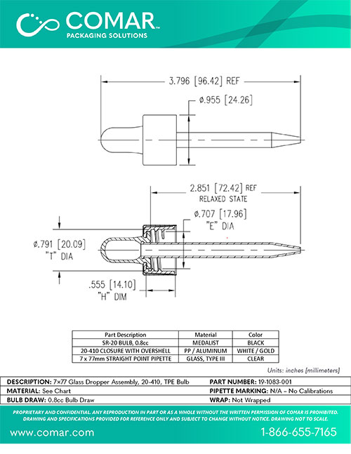 19-1083-001 Comar 7×77 Glass Dropper Assembly, 20-410, TPE Bulb Tech Drawing