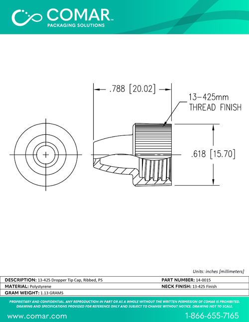 14-0015 Comar 13-425 Dropper Tip Cap, Ribbed, PS Tech Drawing
