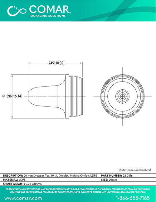 22-0616 Comar 20 mm Dropper Tip, 40 μL Droplet, Molded Orifice, LDPE Tech Drawing