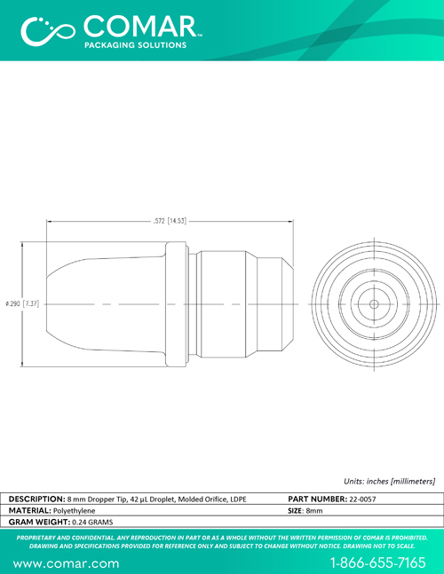 22-0057 Comar 8 mm Dropper Tip, 42 μL Droplet, Molded Orifice, LDPE Tech Drawing
