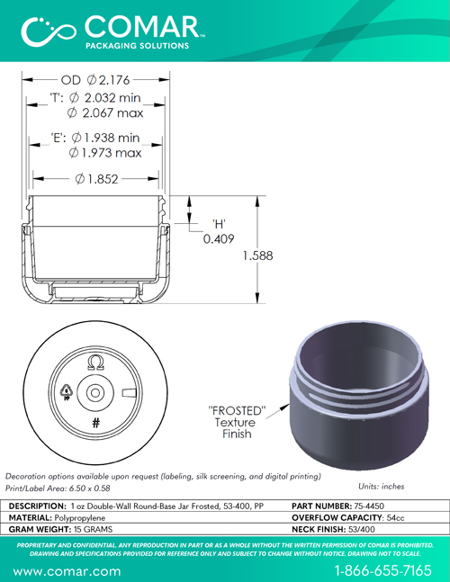 In mold frosting (IMF) is used to produce a 'frosted' surface texture for Beauty and Personal Care applications. Can be produced in custom colors. Can be manufactured with post-consumer recycled content (PP PCR) up to 100%. Decoration options available upon request.
