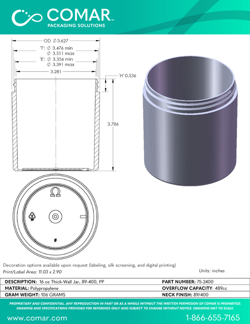 Can be produced in White, Clarified, and custom colors. Can be manufactured with post-consumer recycled content (PP PCR) up to 100%. Decoration options available upon request.