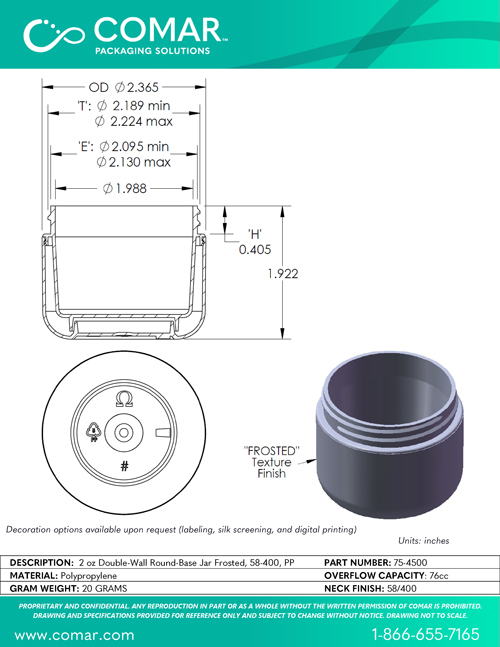 In mold frosting (IMF) is used to produce a 'frosted' surface texture for Beauty and Personal Care applications. Can be produced in custom colors. Can be manufactured with post-consumer recycled content (PP PCR) up to 100%. Decoration options available upon request.