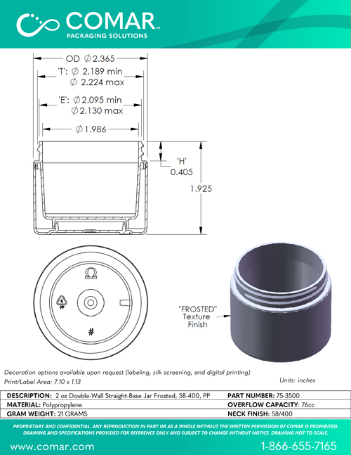 In mold frosting (IMF) is used to produce a 'frosted' surface texture for Beauty and Personal Care applications. Stocked in White. Can be produced in custom colors. Can be manufactured with post-consumer recycled content (PP PCR) up to 100%. Decoration options available upon request.