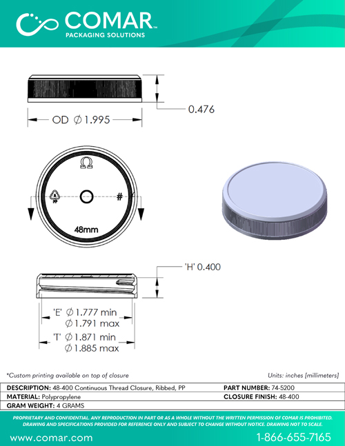 74-5200 Comar 48-400 Continuous Thread Closure, Ribbed, PP Tech Drawing