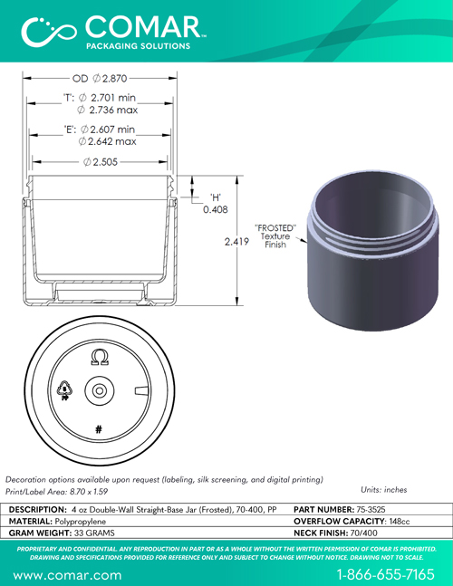 In mold frosting (IMF) is used to produce a 'frosted' surface texture for Beauty and Personal Care applications. Can be produced in custom colors. Can be manufactured with post-consumer recycled content (PP PCR) up to 100%. Decoration options available upon request.