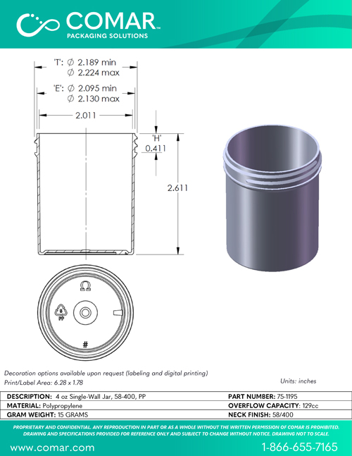 Stocked in White and Clarified. Can be produced in custom colors. Can be manufactured with post-consumer recycled content (PP PCR) up to 100%. Decoration options available upon request.