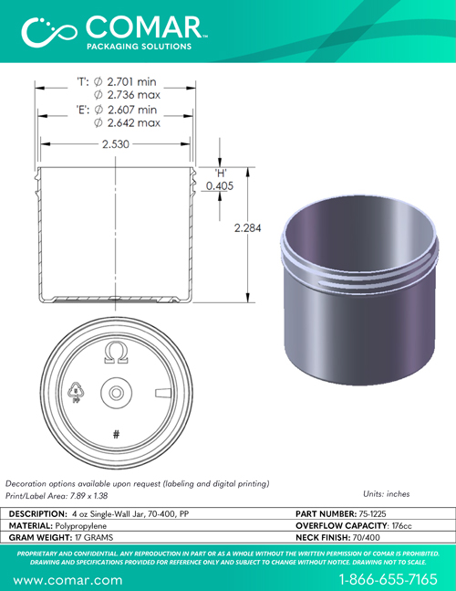 Stocked in White and Clarified. Can be produced in custom colors. Can be manufactured with post-consumer recycled content (PP PCR) up to 100%. Decoration options available upon request.