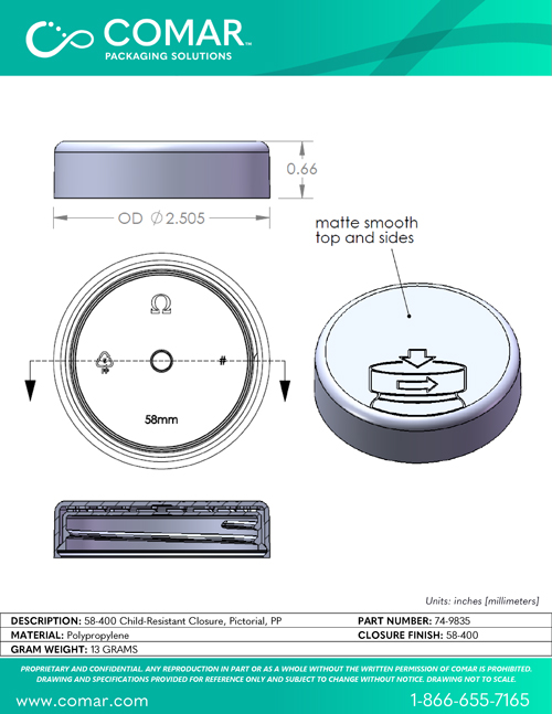 74-9835 Comar 58-400 Child-Resistant Closure, Pictorial, PP Tech Drawing