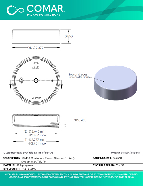 Smooth High Closures provide the look of a taller package without altering the container in any way. In mold frosting (IMF) is used to produce a 'frosted' surface texture for Beauty and Personal Care applications. Can be produced in standard or custom colors and paired with a variety of liners including foam, pressure-sensitive, or heat induction.