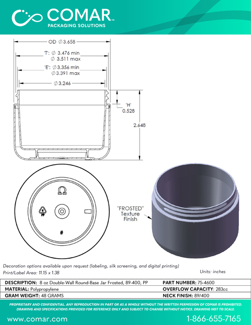 In mold frosting (IMF) is used to produce a 'frosted' surface texture for Beauty and Personal Care applications. Can be produced in custom colors. Can be manufactured with post-consumer recycled content (PP PCR) up to 100%. Decoration options available upon request.