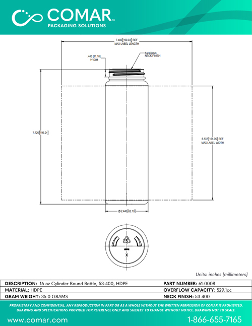 61-0008 Comar 16 oz Cylinder Round Bottle, 53-400, HDPE Tech Drawing