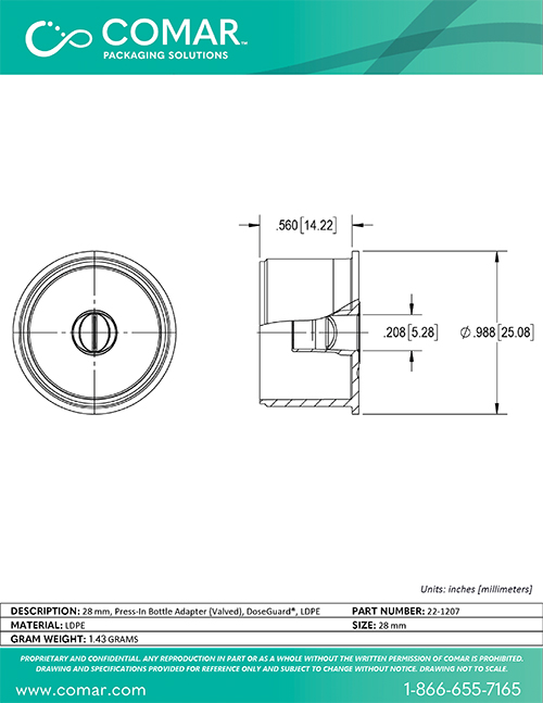 Comar 22-1207 28 mm, Press-In Bottle Adapter (Valved), DoseGuard, LDPE Tech Drawing