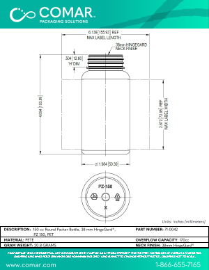71-0042 Comar 150 cc Round Packer Bottle, 38 mm HingeGard®, PZ 150, PET Tech Drawing