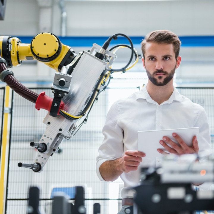 man holding tablet and scowling at robotic machine